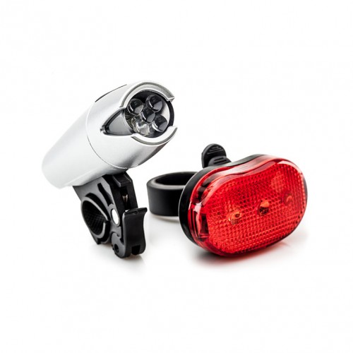 Комплект освещения на велосипед. Передний: Водонепроницаемый, 2 функции. Световой элемент: 5 белых LED. Крепление: к рулю велосипеда. Материал: пластик. Цвет: корпус серый. Питание: ААА (1.5V) - 2 шт. в комплекте. Задний: Водонепроницаемый, 3 функции. Световой элемент: 3 светодиода. Крепление: к велосипеду, к одежде. Питание: ААА (1.5V) - 2 шт. в комплекте. |