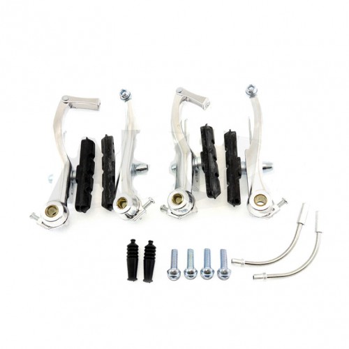 Комплект тормозов (передний + задний). Материал изготовления: алюминий. Тип колодок: резьба. Цвет: серебристый. В комплекте: Тормоз передний с колодками - 1 шт. Тормоз задний с колодками - 1 шт. Болты крепления с шайбами - 4 шт. Направляющая троса тормоза - 2 шт. Резиновые пыльники - 2 шт. |